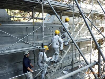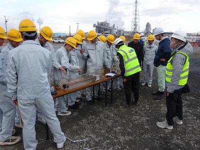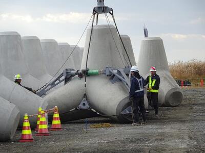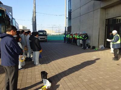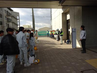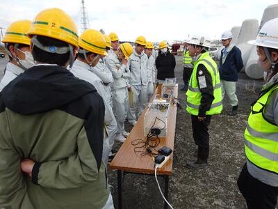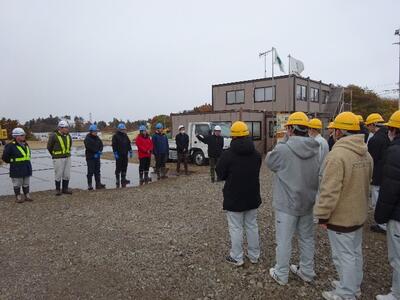 ○12月1日(月)に、株式会社丸本組のご協力により、石巻港雲雀野地区防波堤消波工事の現場見学を実施して頂きました。会場では消波ブロック製作過程の見学し、最新の土木技術について学ぶことができました。