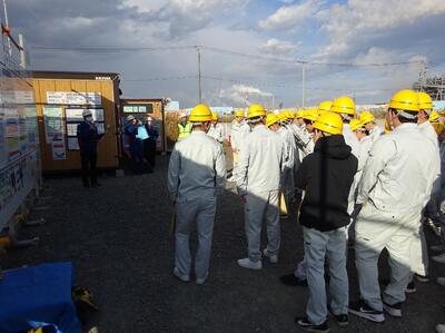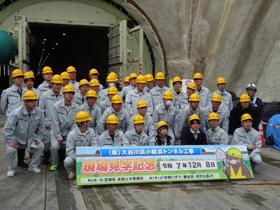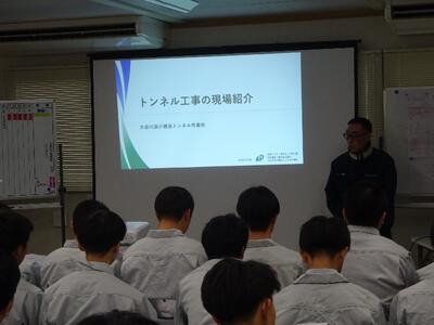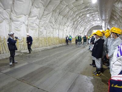 ○宮城県建設業協会石巻支部青年会のご協力により、トンネル工事の現場見学を実施していただきました。現場ではトンネルの構造や役悪などの説明があり、最新の土木技術について学ぶことができました。