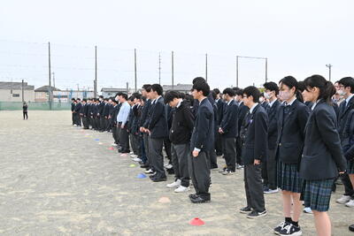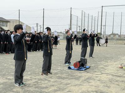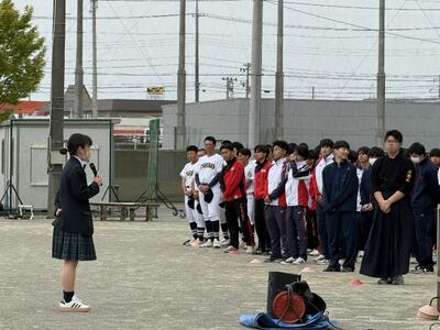 4月13日(月)から22日(水)にかけて、4月23日(木)に実施した地区総体壮行式に向けて、全校生徒で応援練習を行いました。放課後や昼休みに中庭や講堂で、校歌や応援歌、エールを練習し、練習最終日にはどの学年も大きな声で歌えており、一人ひとりの応援しようという気持ちが伝わりました。